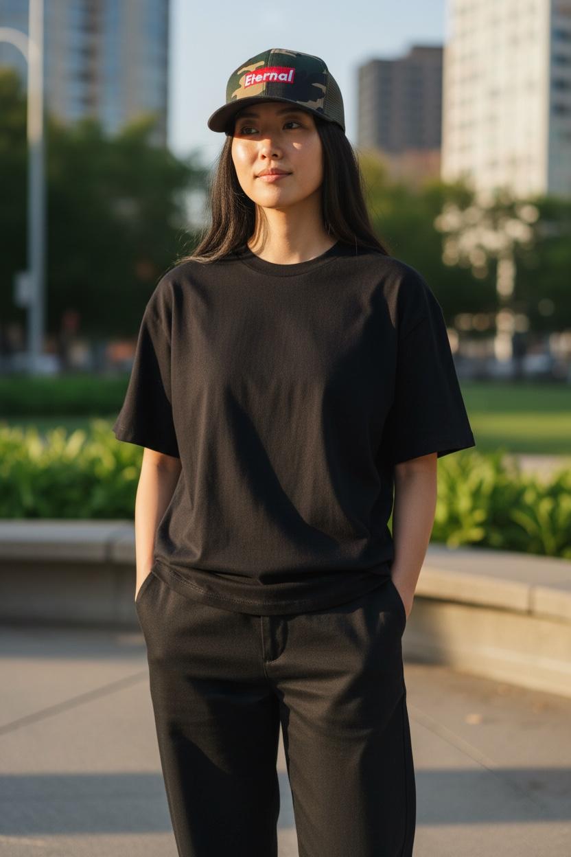 This high quality hat comes with a Black Suede Bill, Eternal Supreme Style Logo, Solid Camo Front Panel with Trucker Mesh on the side and rear panels. custom tape line with Live Forever printed inside.